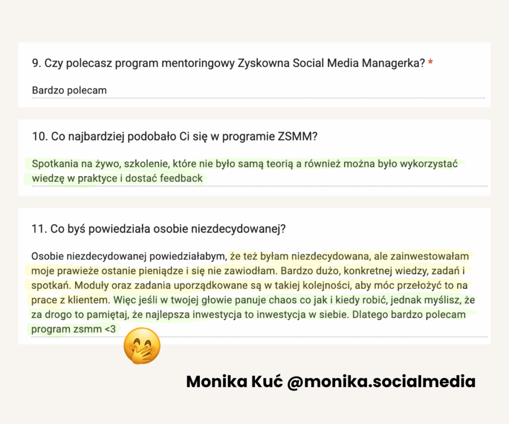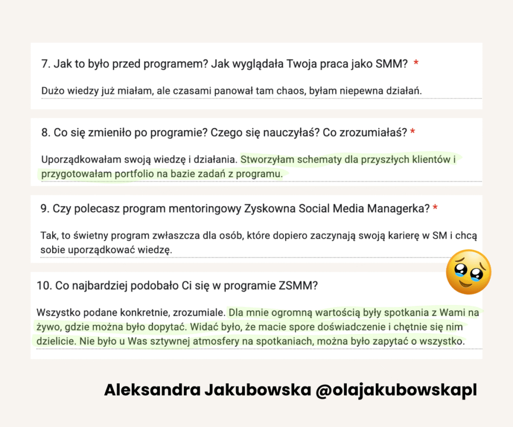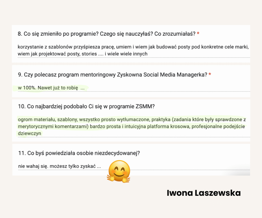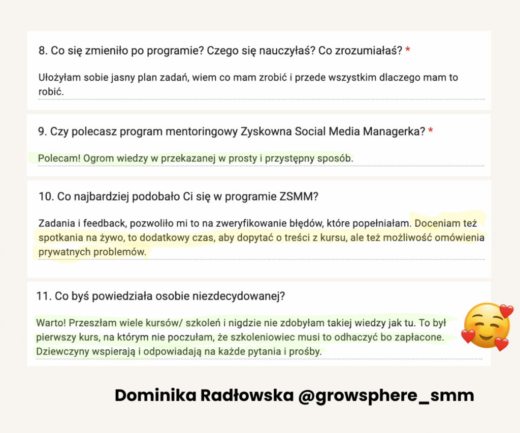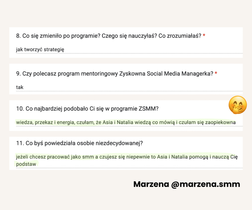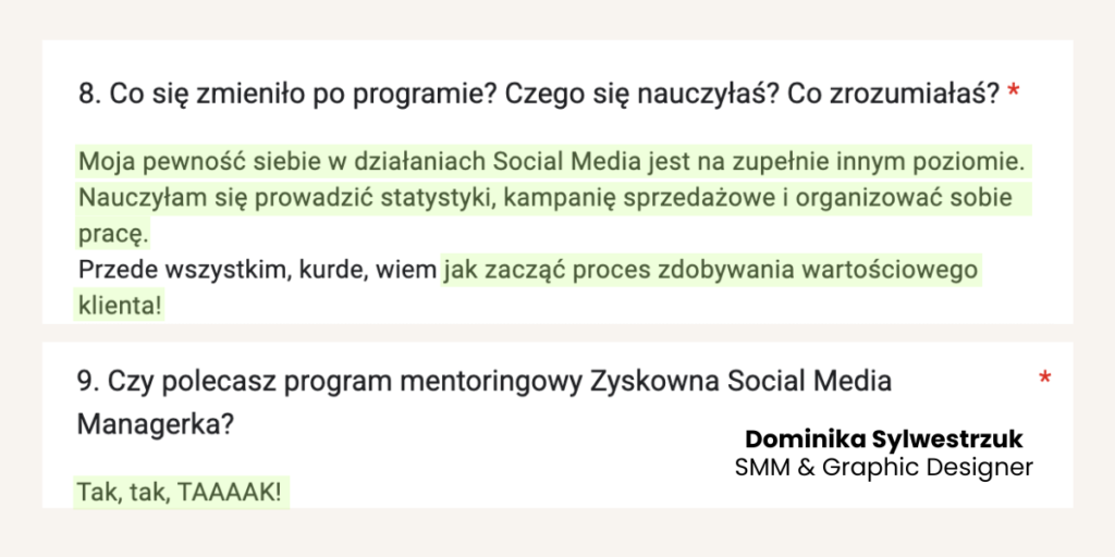 Od lat tworzy programy mentoringowe i społeczności, bo naprawdę lubi uczyć i wspierać innych w rozwoju. W jej szkoleniach wzięło udział już ponad 1500 osób. Na co dzień pracuje z Twoimi przyszłymi klientami, dlatego doskonale wie, czego oczekują od profesjonalnych Social Media Managerek.