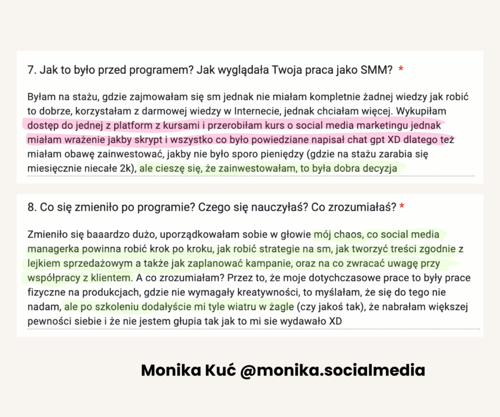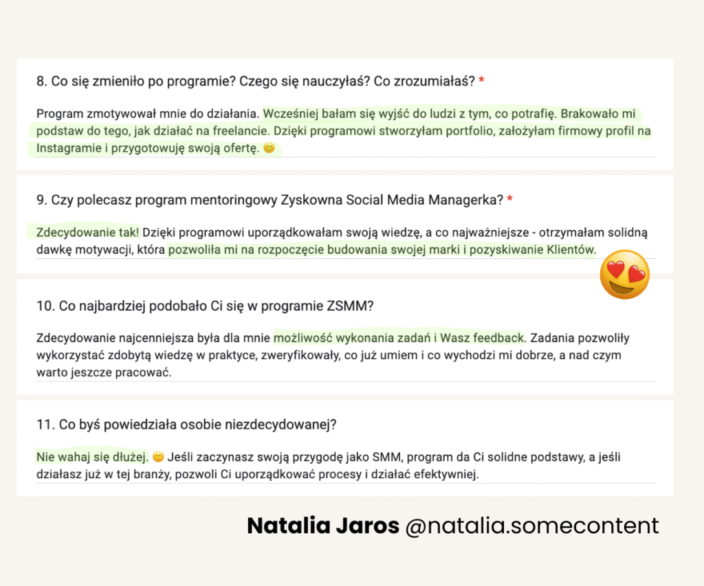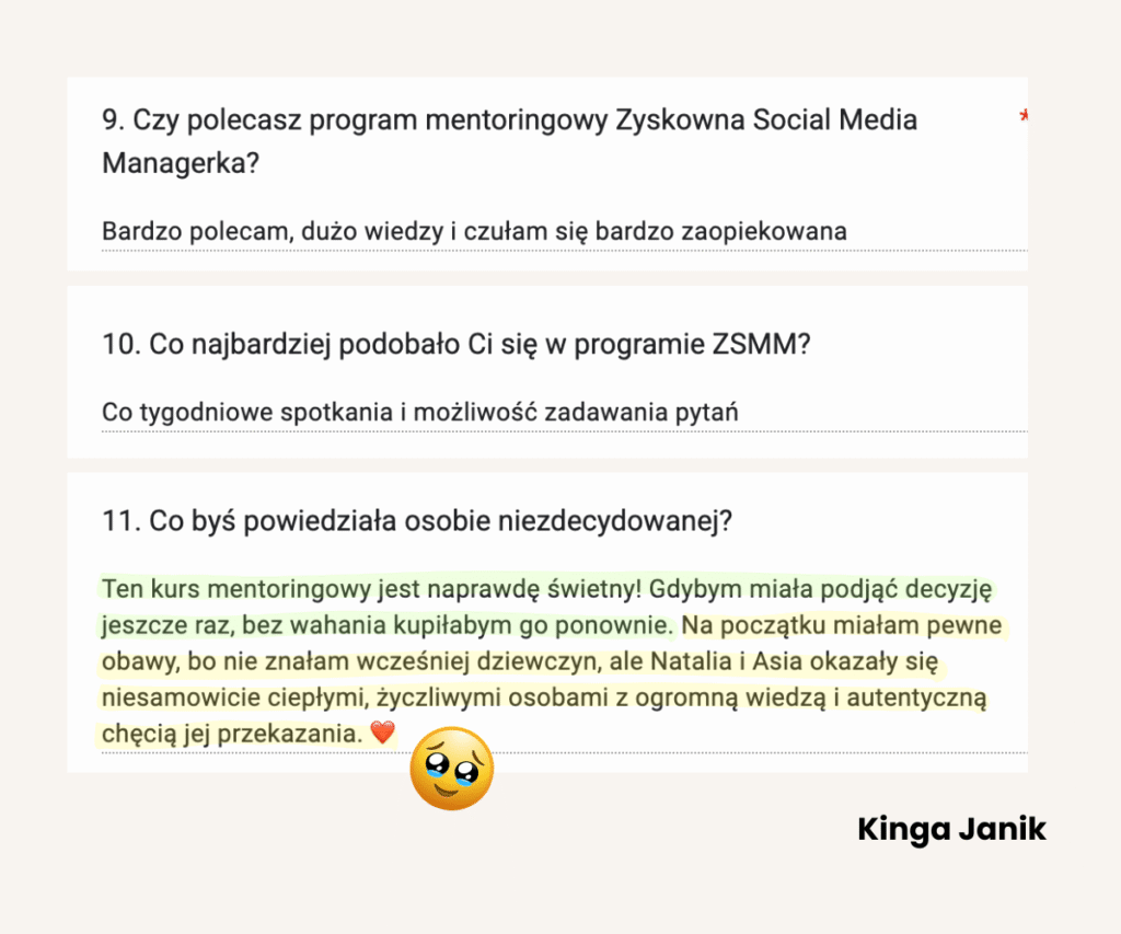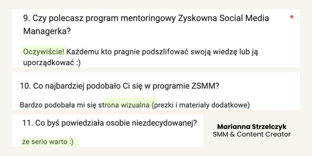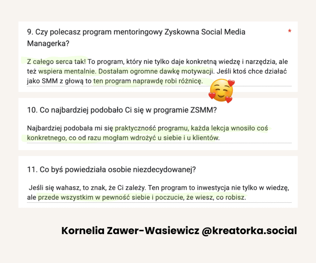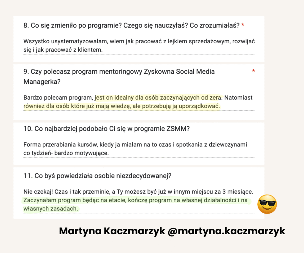 Od lat tworzy programy mentoringowe i społeczności, bo naprawdę lubi uczyć i wspierać innych w rozwoju. W jej szkoleniach wzięło udział już ponad 1500 osób. Na co dzień pracuje z Twoimi przyszłymi klientami, dlatego doskonale wie, czego oczekują od profesjonalnych Social Media Managerek.