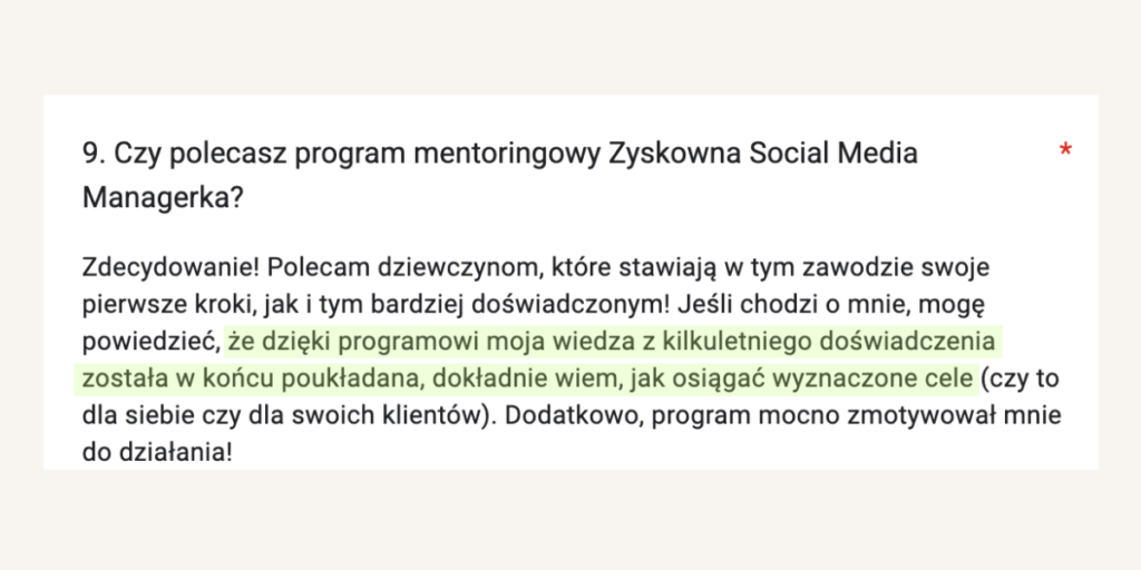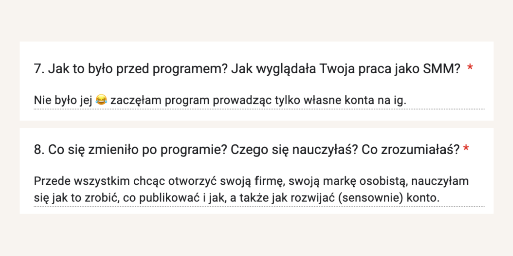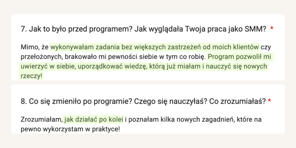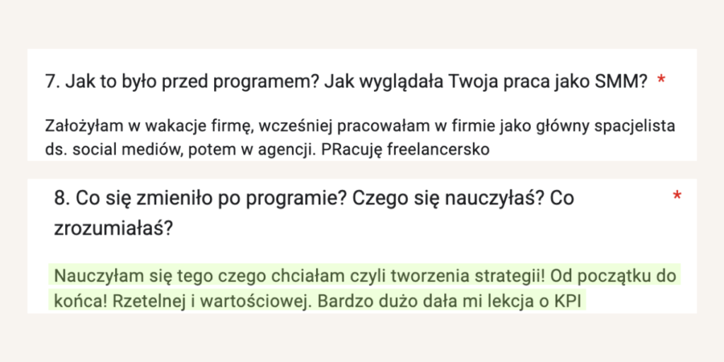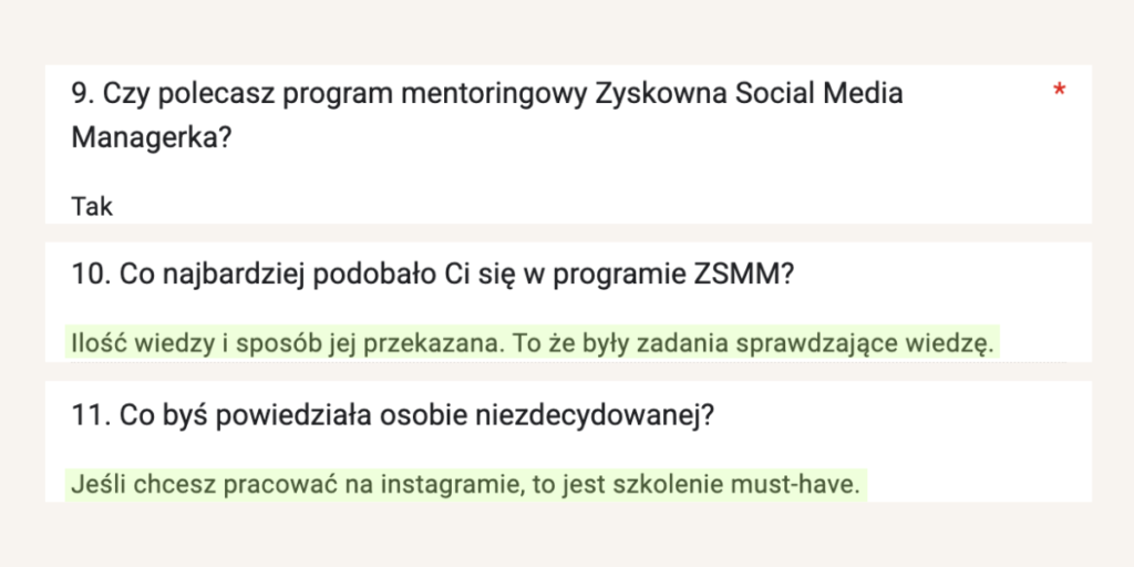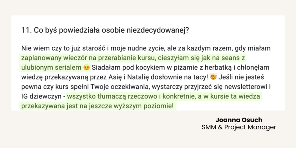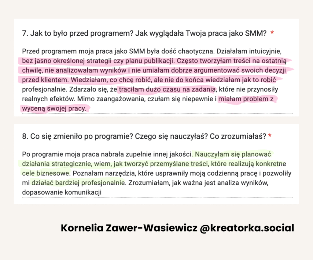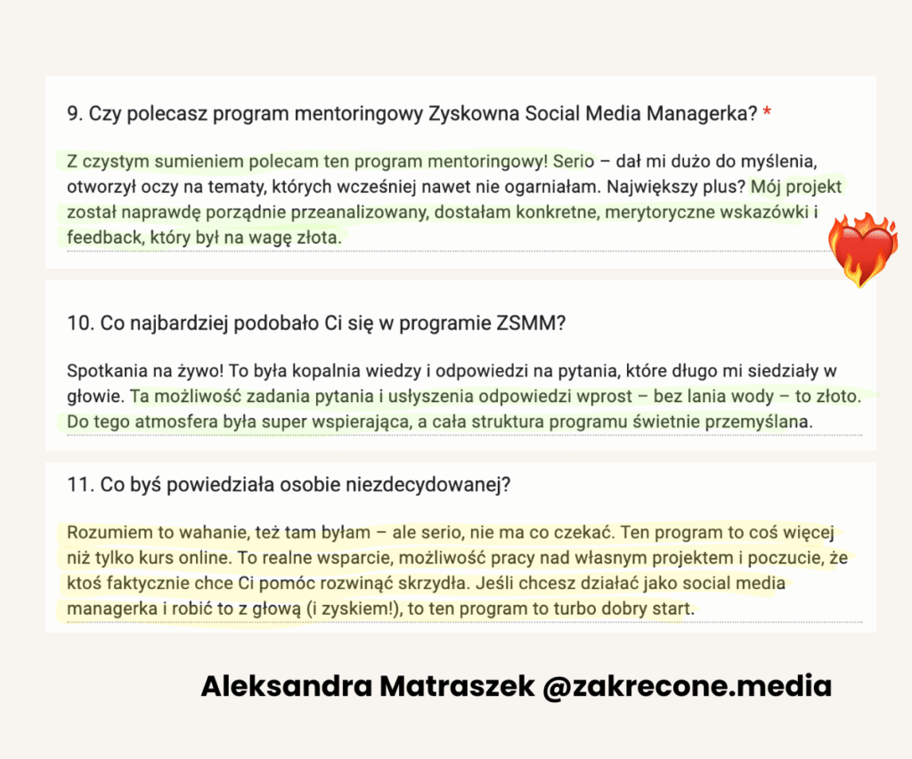 Od lat tworzy programy mentoringowe i społeczności, bo naprawdę lubi uczyć i wspierać innych w rozwoju. W jej szkoleniach wzięło udział już ponad 1500 osób. Na co dzień pracuje z Twoimi przyszłymi klientami, dlatego doskonale wie, czego oczekują od profesjonalnych Social Media Managerek.