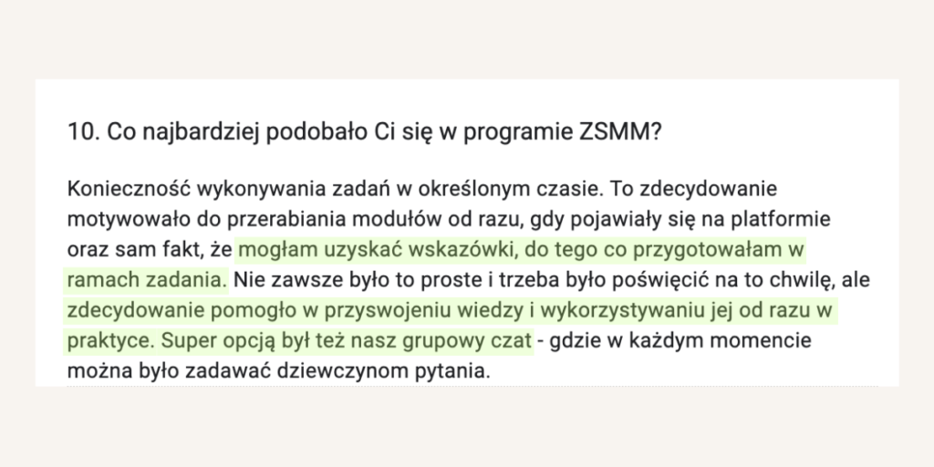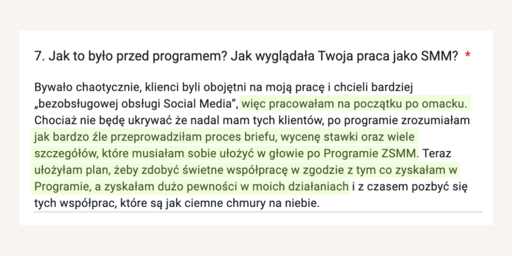 Nasze wsparcie nie musi się skończyć! Dla absolwentek programu ZSMM mamy specjalną ofertę dołączenia do Klubu Zyskowna Freelancerka – dostęp do lekcji z programu + nowe szkolenia + tematyczne spotkania na żywo + dostęp do chatu 24h/7 + feedback do materiałów jak np. oferta, portfolio itd.