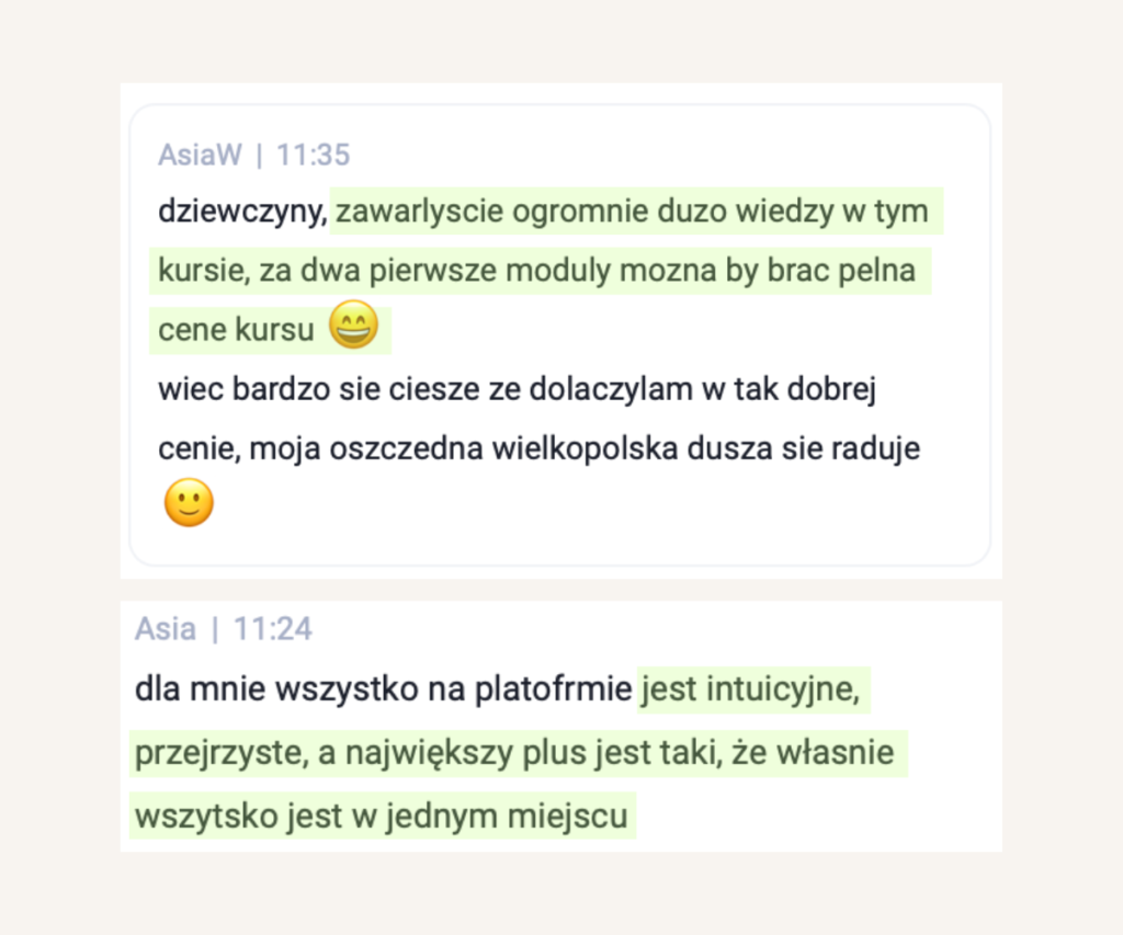 Wszystko w jednym miejscu! Materiały wideo, PDF z cheklistami oraz chat na którym w każdej chwili możesz zadań pytania do nas oraz innych uczestniczek programu. Tam będziemy Cię informować o wszystkich najważniejszych rzeczach. Chat będzie dla Ciebie dostępny przez całe 3 miesiące.