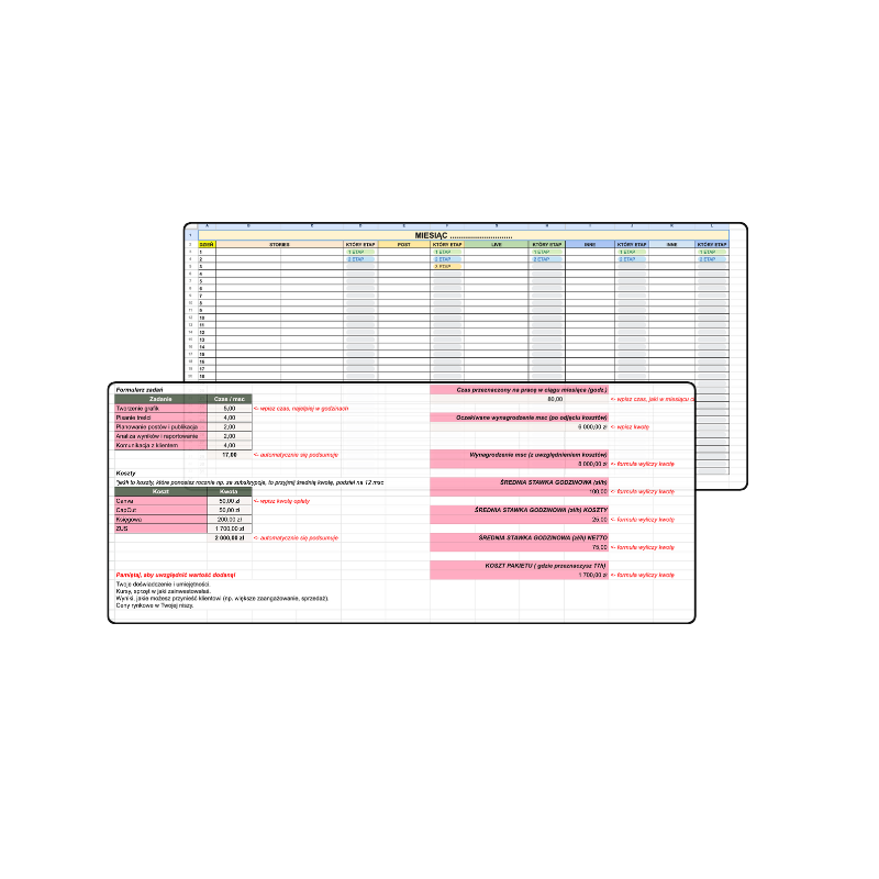 Gotowe szablony, które wystarczy, że tylko uzupełnisz m.in. szablon umowy, planowania contentu, kampanii sprzedażowej, kalkulator wyceny