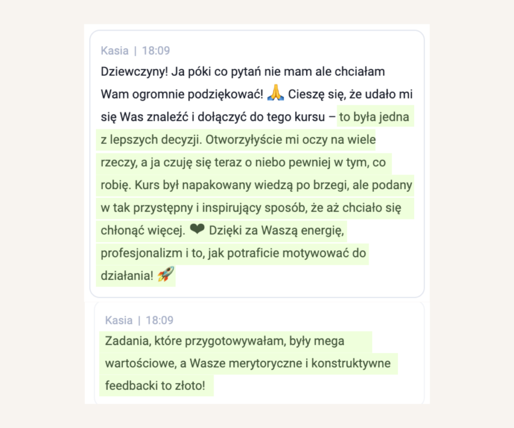 Natychmiast otrzymujesz dostęp do platformy, gdzie będą się znajdować materiały do nauki, chat do kontaktu z nami oraz możliwość uczestnictwa w spotkaniach na żywo. Pierwsze materiały do samodzielnego przerabiania pojawią się 17 lutego 2026. I z każdym kolejnym tygodniem otrzymasz dostęp do kolejnych modułów.