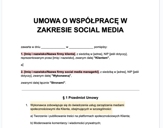 Szablon umowy przygotowany przez prawniczkę