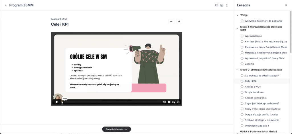 Materiały będą się składać z lekcji wideo - 6 modułów podzielonych na lekcje, a także dodatkowo otrzymasz: checklisty, listy, spisane procesy oraz różnego rodzaju szablony.