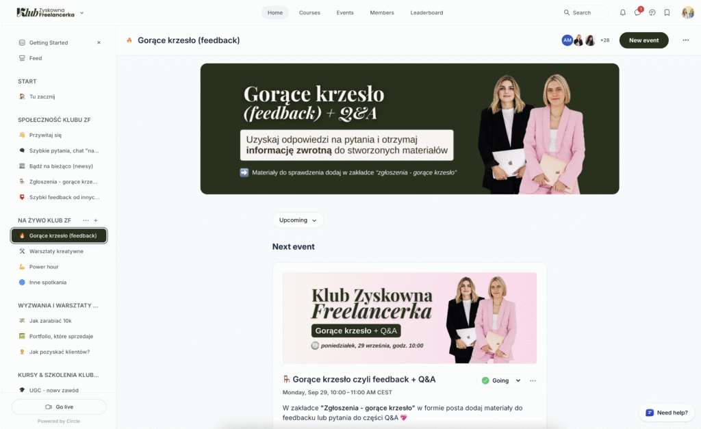 Po okresie 12 tygodni otrzymasz możliwość przedłużenia dostępu do materiałów i społeczności w Klubie Zyskowna Freelancerka, gdzie będziesz mogła dalej poszerzać swoją wiedzę, otrzymywać feedback i wsparcie w swojej zawodowej drodze